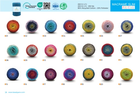250 Gr (-/+) MACRAME SLIM 200 M (-/+) - 218 Yds 80% Recycled Cotton – 20% Poliester 9001꞉2015 01 02 03 04 05 06 07 01 08 09 10 11 12 13 14 15 16 17 18 19 20 21 www.beadyarn.com