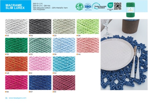 250 Gr (-/+) MACRAME 200 M (-/+) - 218 Yds SLIM LUREX 70% Recycle Cotton – 20% Metallic Yarn 10% Polyester 9001꞉2015 103 106 123 128 130 133 136 146 148 151 152 155 157 161 www.beadyarn.com