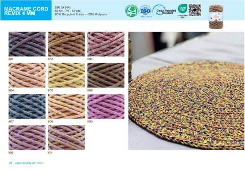 MACRAME CORD 250 Gr (-/+) REMIX 4 MM 55 Mt (-/+) - 61 Yds 80% Recycled Cotton - 20% Polyester 9001꞉2015 01 02 03 04 05 06 07 08 09 10 11 www.beadyarn.com