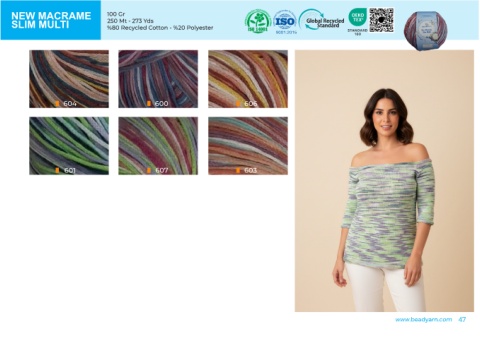 NEW MACRAME 100 Gr 250 Mt - 273 Yds SLIM MULTI %80 Recycled Cotton - %20 Polyester 9001꞉2015 604 600 606 601 607 603 www.beadyarn.com