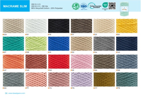 250 Gr (-/+) MACRAME SLIM 200 M (-/+) - 218 Yds 80% Recycled Cotton – 20% Polyester 9001꞉2015 024 101 115 117 123 125 127 128 131 132 134 140 147 149 160 161 166 168 169 171 174 175 177 179 www.beadyarn.com